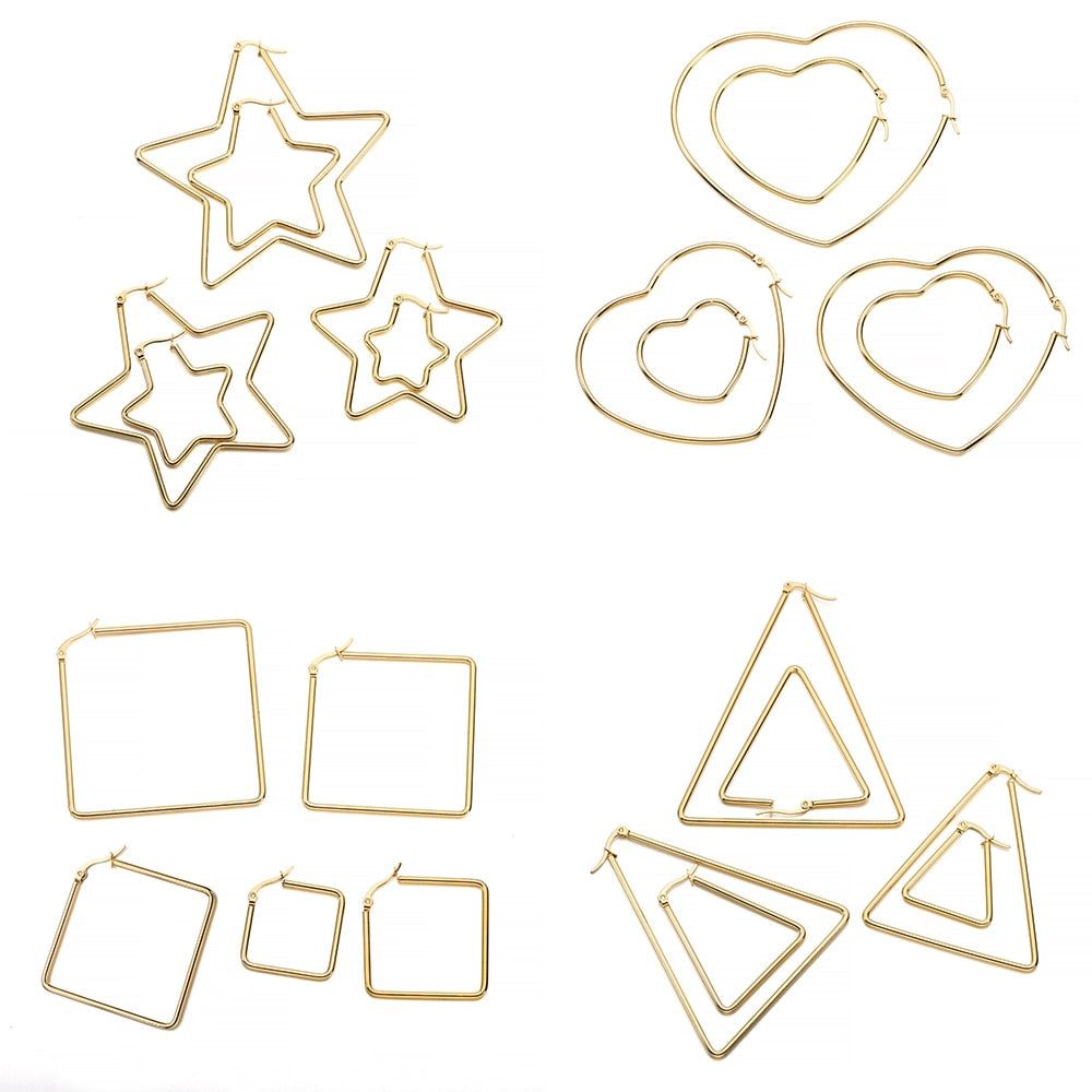Boucles d'oreilles en acier inoxydable dorĂ© : Ă©toile, carrĂ©, cĆur, 6 piĂšces